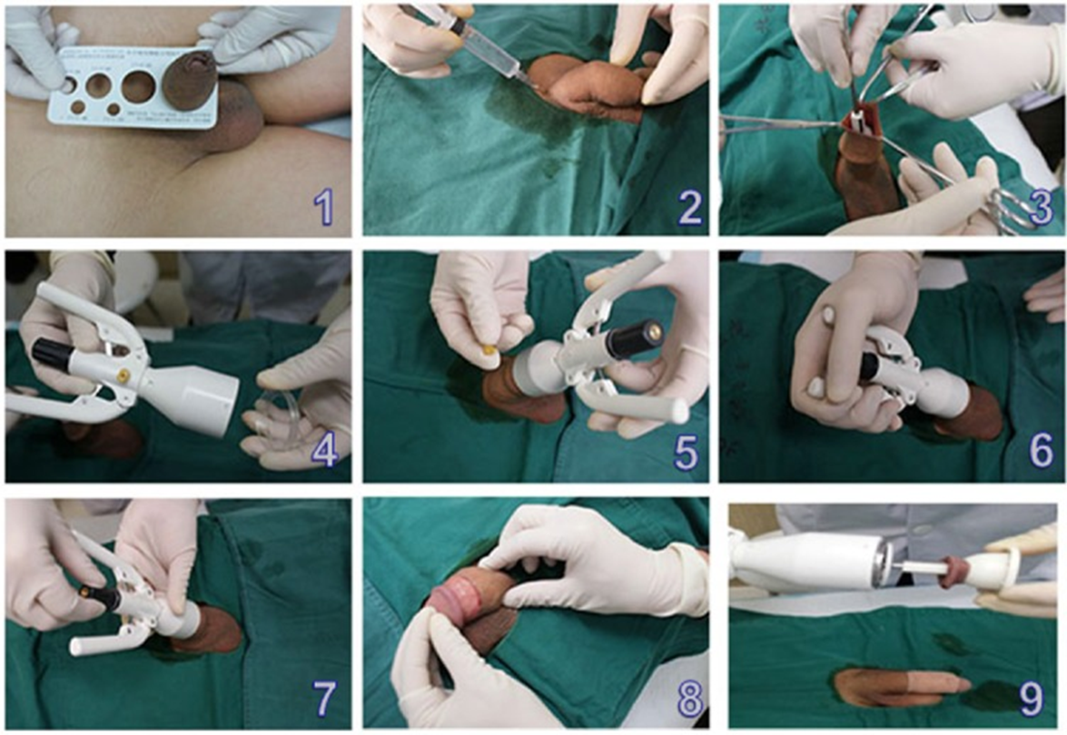 Stapler grubunda zımba cihazının uygun boyutu ilk olarak penisin penis başının hemen altından ölçülmesiyle belirlendi. Penis daha sonra cerrahi olarak povidon-iyot ile dezenfekte edildi. %1'lik lidokain ile dorsal penil sinir bloğu ve çevresel blok uygulandı ve tedavi tanımlanmış bir protokole göre gerçekleştirildi (Şekil 2).