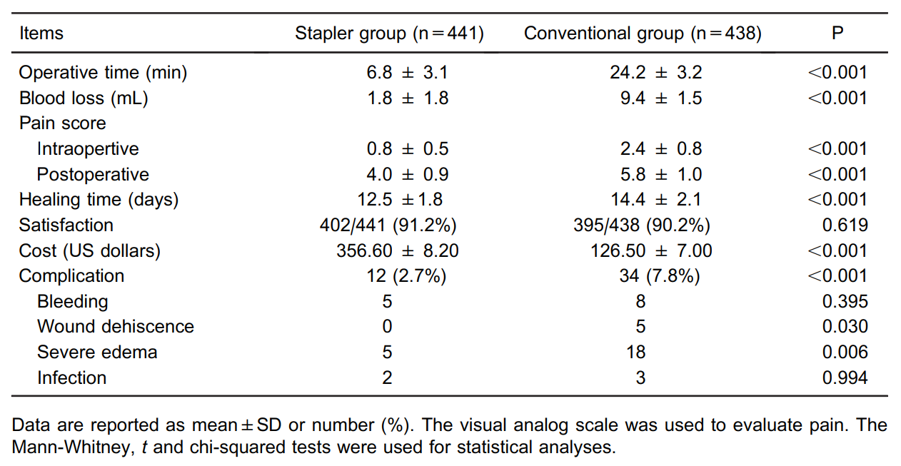 Tablo 2 zımba ve konvansiyonel sünnetin sonuçlarını karşılaştırmaktadır. Ameliyat süresi ve kan kaybı hacmi, stapler grubunda konvansiyonel gruba göre anlamlı olarak daha düşüktü (sırasıyla 6,8 ± 3,1 - 24,2 ± 3,2 dakika ve 1,8 ± 1,8 - 9,4 ± 1,5 mL; her ikisi için de P<0,01). İntraoperatif ve postoperatif ağrı skorları, stapler grubunda konvansiyonel gruba göre anlamlı olarak daha düşüktü (sırasıyla 0,8 ± 0,5'e karşı 2,4 ± 0,8 ve 4,0 ± 0,9'a karşı 5,8 ± 1,0; her ikisi için de P<0,01). Ek olarak, zımba grubu, geleneksel gruba göre önemli ölçüde daha düşük komplikasyon oranına sahipti (sırasıyla %2,7'ye karşı