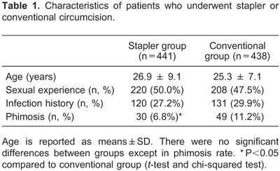 Hasta özellikleri iki grup arasında iyi dengelendi. Yaş, cinsel deneyim veya enfeksiyon öyküsünde istatistiksel olarak anlamlı bir fark yoktu. Konvansiyonel gruptaki daha fazla hastada fimozis vardı. Tablo 1, bu çalışmadaki tüm hastaların özelliklerini listeler.